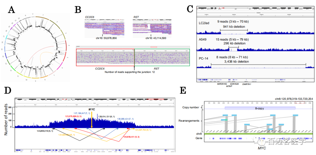使用長讀長測序數(shù)據(jù),嘗試檢測比點(diǎn)突變大的結(jié)構(gòu)畸變(圖2A)。從LC2/ad的MinION/PromethION數(shù)據(jù)集中,成功鑒定出12條reads與CCDC6-RET融合基因的junction位點(diǎn)直接重疊,這是該細(xì)胞系已知的“癌癥驅(qū)動(dòng)突變”(圖2B)。進(jìn)一步嘗試鑒定大的缺失,前人報(bào)道抑癌基因CDKN2A基因周圍有大的缺失,發(fā)生在LC2/ad,A549和PC-14細(xì)胞中。使用這項(xiàng)研究中的MinION/PromethION數(shù)據(jù)集,我們?cè)俅未_認(rèn)了該基因在各細(xì)胞中的缺失(圖2C)。此外,每個(gè)CDKN2A缺失的√確連接點(diǎn)在細(xì)胞類型之間是不同的。
