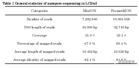使用納米孔測序儀MinION及其更高通量PromethION平臺(tái)進(jìn)行了長讀長全基因組測序分析。首先通過對(duì)LC2/ad的基因組進(jìn)行測序來驗(yàn)證新型PromethION儀器的性能,LC2/ad是源自日本肺腺癌患者的肺癌細(xì)胞系。作為參考,作者從總共33個(gè)MinION runs(R9.5)中收集了全基因組測序數(shù)據(jù),以31×的總測序深度覆蓋了整個(gè)人類基因組,共有7,282,846條reads(93,813,338,154 base)。reads的*大長度和N50長度分別為2,495,160 bp和30,606 bp。采用Minimap2將67.5%的reads比對(duì)到人類參考基因組UCSC hg38。比對(duì)上的reads平均長度為16,452 bp,總體序列一致性平均為82%,比以前的長讀長人類癌癥基因組測序分析顯著增長。PromethION測序需要大約三個(gè)flowcells才能產(chǎn)生總共10,064,668個(gè)reads(100,440,433,160 bp),總覆蓋率為33x,Reads的*大長度和N50長度分別為987,834 bp和32,710 bp。使用Minimap2,將69.4%的讀數(shù)定位到參考基因組。比對(duì)上的reads平均長度為13,620 bp,平均一致性為84.8%。值得注意的是,對(duì)于31X 93G數(shù)據(jù)量,PromethION平臺(tái)不需要制備多個(gè)文庫33次測序,因此與MinION相比,PromethION所需的起始DNA總量可減少十倍以上。