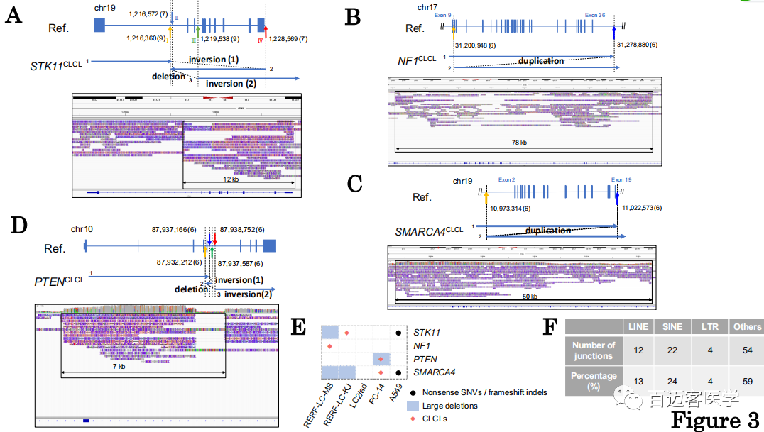 在其他細(xì)胞系中也成功鑒定出以下數(shù)量的CLCL:LC2/ad中有16個(gè),A549中有1個(gè),RERF-LC-KJ中有7個(gè),RELF-LC-MS中有7個(gè),PC-14中有11個(gè)。重要的是,CLCLs甚至出現(xiàn)在關(guān)鍵的癌癥基因中,例如STK11,NF1,SMARCA4和PTEN基因。異常的結(jié)構(gòu)各不相同,并且由于其復(fù)雜的結(jié)構(gòu)和受累區(qū)域的大小,傳統(tǒng)的基于短讀長測序分析的方法不易檢測到它們中的大多數(shù)。相對(duì)簡單的一種是在RERF-LC-MS細(xì)胞的NF1基因中檢測到的(圖3B),內(nèi)含子9(chr17:31,200,948)和最后一個(gè)外顯子36的下游區(qū)域(chr17:31,278,880;在交界處有6條reads支持)之間的串聯(lián)串聯(lián)重復(fù)。在另一種情況下,SMARCA4 CLCL的結(jié)構(gòu)顯示出從內(nèi)含子1(chr19:10,973,314)到內(nèi)含子20(chr19:11,022,573;在交界處有8條reads支持;圖3C)。在PC-14中的PTEN結(jié)構(gòu)中發(fā)現(xiàn)了更復(fù)雜的情況,該CLCL是倒位和缺失的組合(圖3D)。在這些相對(duì)簡單的情況下,將Illumina短reads重新映射到已發(fā)現(xiàn)的junction位點(diǎn)可驗(yàn)證重建結(jié)構(gòu)的√確識(shí)別。