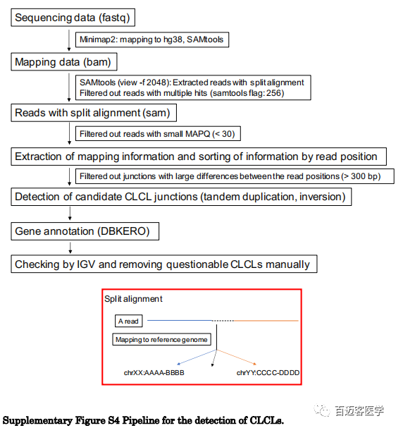 為了更普遍地識(shí)別所有肺癌細(xì)胞系其他基因座中的CLCL,作者構(gòu)建了一條新的分析性生物信息學(xué)流程。簡而言之,利用了來自比對(duì)結(jié)果的split比對(duì)信息,根據(jù)reads位置對(duì)比對(duì)信息進(jìn)行排序,并提取了候選CLCL。相關(guān)的reads被重組以重建其結(jié)構(gòu)。