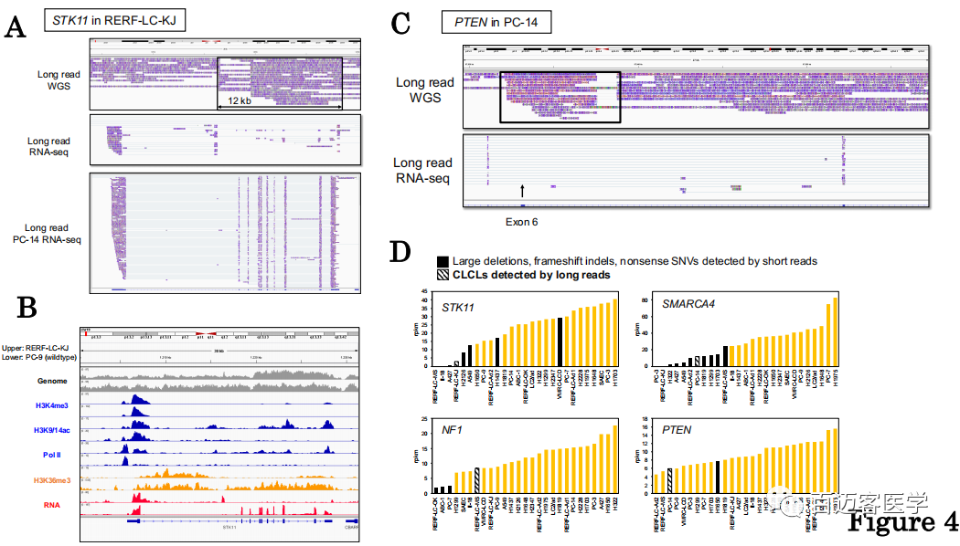 在很多細(xì)胞類型的許多關(guān)鍵基因中發(fā)現(xiàn)了新的CLCL型畸變后,立即提出的問題是它們以何種方式產(chǎn)生轉(zhuǎn)錄或表觀基因組后果。全長轉(zhuǎn)錄組測序-使用MinION重新生成并分析了全長cDNA測序數(shù)據(jù)。并利用了以前的Illumina短讀長RNA-seq和ChIP-seq數(shù)據(jù)。在RERF-LC-KJ細(xì)胞中,短讀長序列數(shù)據(jù)表明STK11轉(zhuǎn)錄物在內(nèi)含子1處異常剪接,并且轉(zhuǎn)錄躍遷到CLCL結(jié)構(gòu)之前。代表全長轉(zhuǎn)錄本的MinION reads進(jìn)一步指明√確的剪接模式和轉(zhuǎn)錄終止位點(diǎn)(圖4A)。對(duì)于幾乎所有的轉(zhuǎn)錄本,第一次剪接均發(fā)生在異常位置(來自chr19:1,216,268),并且轉(zhuǎn)錄根據(jù)CLCL結(jié)構(gòu)發(fā)生(RNA-seq reads涵蓋從chr19:1,216,572至chr19:1,228,569的斷點(diǎn)II-IV)。在下游CLCL區(qū)域內(nèi)也觀察到一些異常轉(zhuǎn)錄(中間圖,圖4A)。在STK11基因是野生型的PC-14細(xì)胞中未觀察到這種異常轉(zhuǎn)錄模式(下圖,圖4A)。