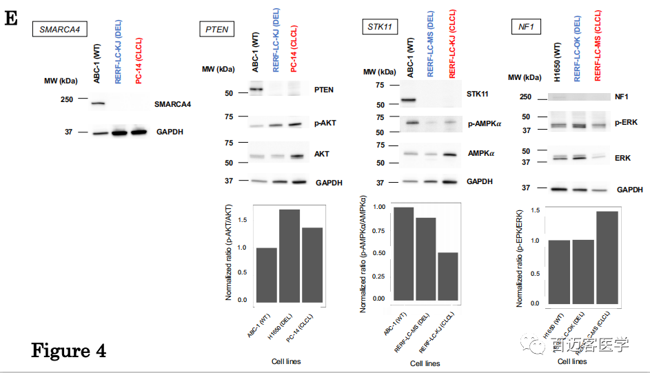 為了解決CLCL的生物學(xué)意義,作者研究了受CLCL影響的基因座如何引起蛋白質(zhì)表達(dá)水平及其相關(guān)信號(hào)通路變化。蛋白質(zhì)印跡WB分析發(fā)現(xiàn)STK11,NF1,SMARCA4和PTEN的蛋白質(zhì)在這些基因中帶有CLCL的細(xì)胞中完全丟失了(圖4E)。進(jìn)一步檢查了下游蛋白的激活狀態(tài),在所有檢查的case中均觀察到了預(yù)期的信號(hào)通路破壞。磷酸化的AKT(phospho-AKT)相應(yīng)地激活mTOR信號(hào)通路,而PTEN抑制AKT的磷酸化。觀察到phospho-AKT異常上調(diào),反映了PC-14細(xì)胞(PTEN-CLCL)中PTEN的功能喪失。AMPK是在維持細(xì)胞動(dòng)態(tài)平衡中起重要作用的基因,AMPK蛋白在其α亞基處的磷酸化被STK11激活。在RERF-LC-KJ細(xì)胞(STK11-CLCL)中,其激活受到損害。NF1基因是RAS的負(fù)調(diào)控因子,位于RAS信號(hào)通路下游的磷酸化ERK在RERF-LC-MS細(xì)胞(NF1-CLCL)中異常上調(diào)。無論是由于常規(guī)畸變還是CLCL,相應(yīng)基因的蛋白質(zhì)明顯丟失,但其后果仍會(huì)根據(jù)情況而有所不同。例如,即使STK11蛋白在RERF-LC-MS細(xì)胞(STK11缺失)和RERF-LC-KJ細(xì)胞(STK11-CLCL)中類似地消失,在RERF-LC-KJ細(xì)胞(STK11-CLCL)中磷酸-AMPKα的增強(qiáng)比例也更高。RERF-LC-OK(NF1-缺失)細(xì)胞系中NF1蛋白影響幾乎無法檢測到,而對(duì)RERF-LC-MS細(xì)胞(NF1-CLCL)的影響卻很明顯。表明,其他途徑有時(shí)可以彌補(bǔ)關(guān)鍵蛋白的缺失。