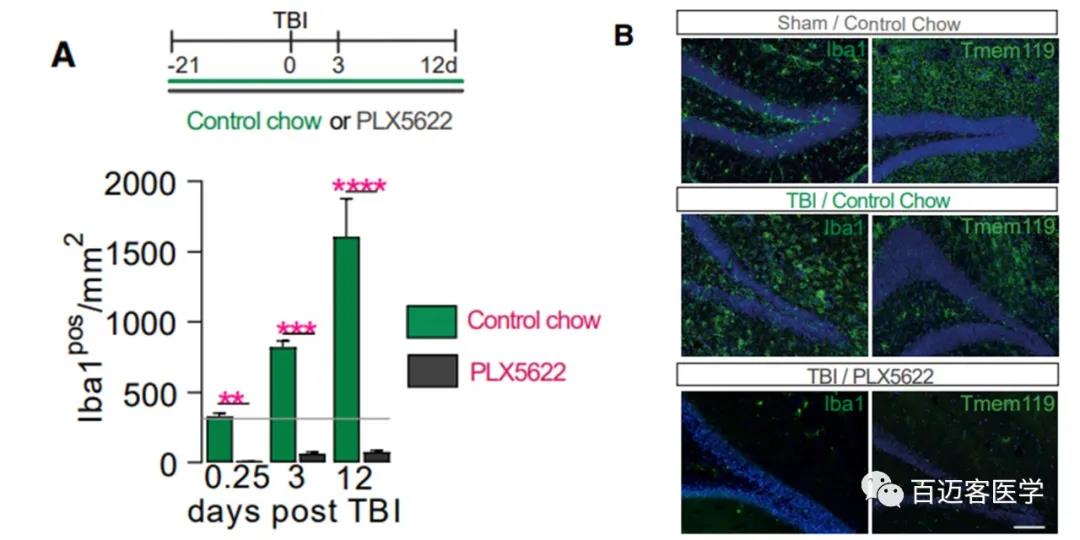 圖1B.plx5622處理小鼠術(shù)后12天海馬內(nèi)Iba1pos和TMEM119pos小膠質(zhì)細胞(綠色)的丟失