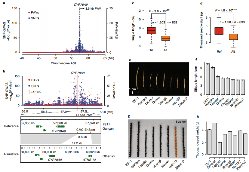 泛基因組可以結(jié)合GWAS數(shù)據(jù),有效提高GWAS 的準(zhǔn)確性,捕獲到更加完整的遺傳變異信息。通常,GWAS分析是將個(gè)體材料與參考基因組進(jìn)行比對(duì),然后將得到的 SNP 與表型進(jìn)行關(guān)聯(lián)分析,當(dāng)GWAS 分析參考基因組不存在的功能基因引起的表型時(shí),會(huì)出現(xiàn) GWAS 定位區(qū)間與實(shí)際功能基因之間較大偏差甚至檢測(cè)不到的情況。但以泛基因組為參考基因組,把結(jié)構(gòu)變異作為基因型數(shù)據(jù)用于 GWAS 分析,可以有效解決這類(lèi)因單一參考基因組而導(dǎo)致的信息不全問(wèn)題。例如,油菜以泛基因組鑒定到的 PAV 為基因型進(jìn)行GWAS 分析,直接鑒定到基因BnaA9.CYP78A9啟動(dòng)子區(qū)存在一段 3.9 kb 的插入,該變異嚴(yán)重影響油菜的角果長(zhǎng)和粒重[2]。結(jié)構(gòu)變異相關(guān)的GWAS研究更具有新意,也是后續(xù)研究的熱點(diǎn)。