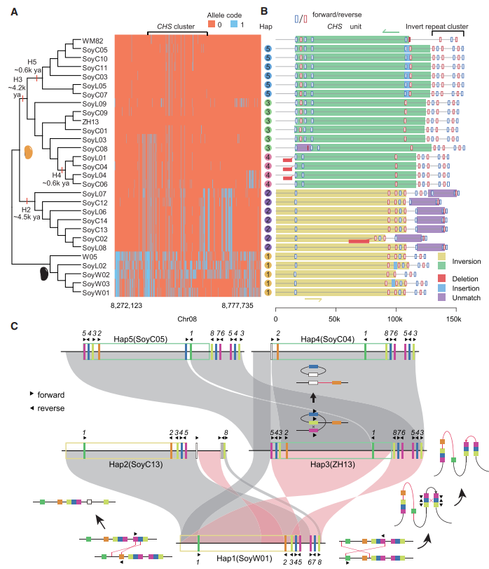泛基因組擁有群體完整的基因組多樣性,可以為植物進(jìn)化與馴化研究提供更完整、更寬泛的支持。如大豆的種皮顏色是大豆馴化過(guò)程中的一個(gè)重要表型性狀,從野生大豆的黑色種皮演變成栽培大豆的黃色種皮,是因?yàn)橐粋€(gè)查爾酮合成酶基因發(fā)生序列倒置或序列復(fù)制后倒置導(dǎo)致了該基因沉默。通過(guò)大豆泛基因組單倍體型進(jìn)化分析,將29份材料分為5個(gè)主要的單倍型(H1- H5),并對(duì)不同單倍體型馴化時(shí)間和順序進(jìn)行了研究,剖析了大豆種皮顏色馴化的歷史[3]。