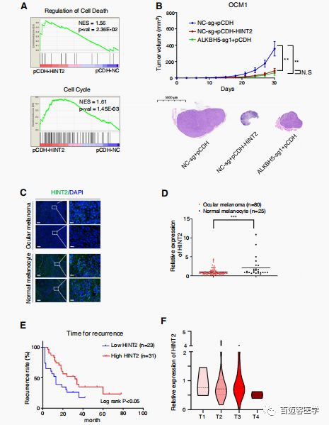 在眼黑色素瘤細胞中,在mRNA水平和蛋白水平均過表達HINT2。發(fā)現(xiàn)過表達HINT2后,眼黑色素瘤細胞的細胞增殖、細胞遷移、和克隆形成明顯受到抑制,細胞凋亡增加。此外,GSEA顯示在腫瘤細胞中HINT2促進凋亡和細胞死亡(Fig3a)。為了確定HINT2在體內(nèi)腫瘤特征中的作用,過表達HINT2的眼黑色素瘤細胞進行了皮下移植。結(jié)果顯示:相對于對照組(Fig3b, A組)來說,實驗組HINT2過表達組(Fig3b, B組)腫瘤體積持續(xù)降低。為了研究這些蛋白表達的變化是否在樣本中發(fā)生,在眼黑色素瘤和正常組織中進行IF實驗(Fig3c),發(fā)現(xiàn)HINT2確實在腫瘤樣本中下調(diào)。除此之外,在眼黑色素瘤組織樣本中,低表達的HINT2與不良預(yù)后高度相關(guān)(Fig3e)。