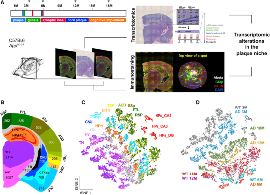 NGS技術(shù)飛速發(fā)展,在生理和病理方面定義細胞狀態(tài)得到巨大進步。例如,在AD領(lǐng)域,我們現(xiàn)在知道小膠質(zhì)細胞對β-淀粉樣蛋白(Aβ)斑塊表現(xiàn)出典型的活化反應(yīng)。神經(jīng)元、星形膠質(zhì)細胞和少突膠質(zhì)細胞比小膠質(zhì)細胞更難分離,但單細胞核是一個合適的選擇。這些細胞的胞質(zhì)mRNA不能很好的展示,而且解離手段誘導(dǎo)了人為的表達改變?;镜膯栴}還是,丟失了大部分的空間信息,包括細胞和淀粉樣蛋白斑的關(guān)系。而空間轉(zhuǎn)錄組可以解決這一問題,它的空間標簽陣列可以記錄測序分子的空間位置,無偏地分析組織上的轉(zhuǎn)錄本信息。