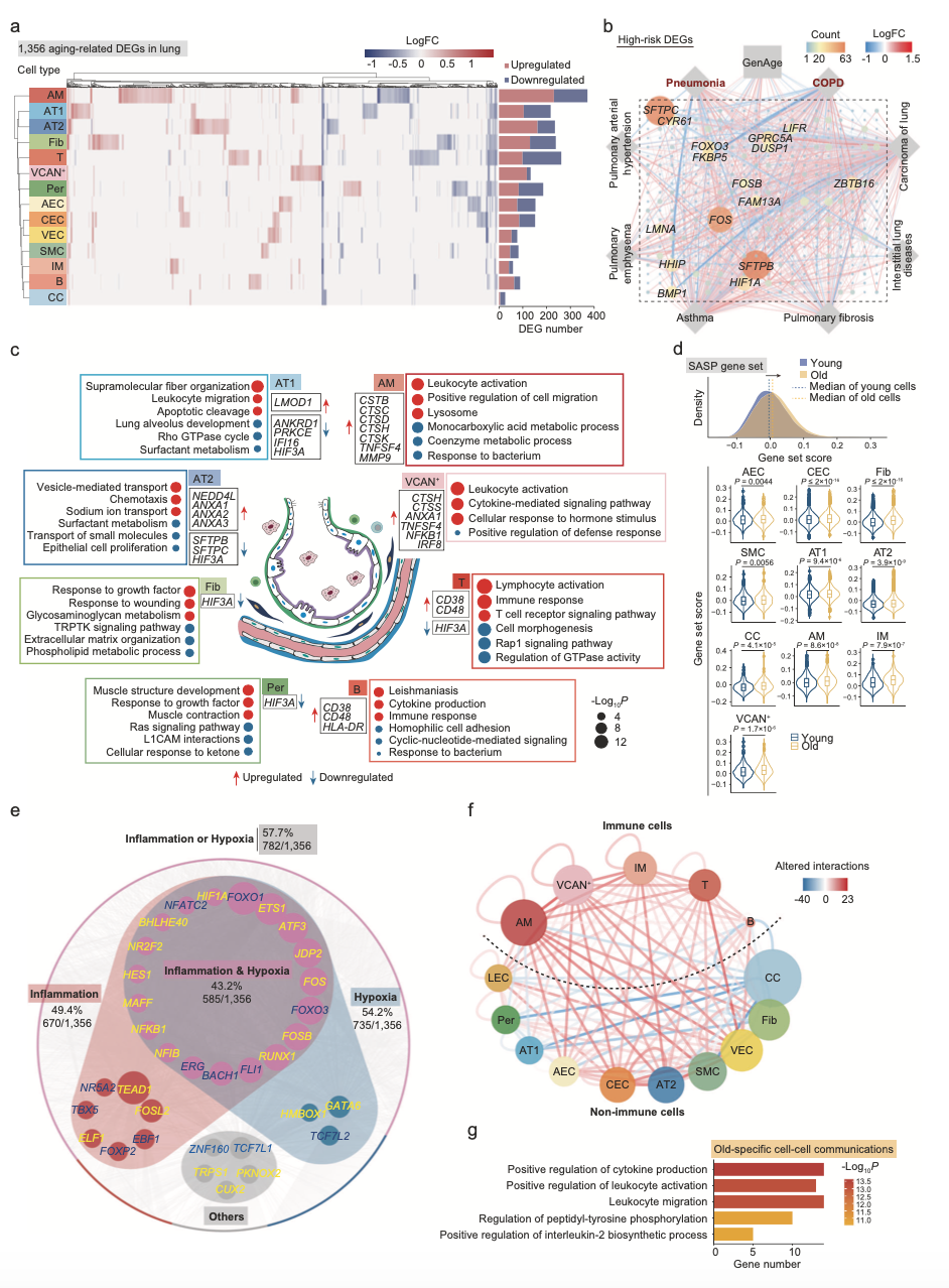 為了闡明細(xì)胞水平上與衰老相關(guān)的分子機制,作者在個性肺細(xì)胞中識別和衰老相關(guān)的轉(zhuǎn)錄組變化。通過差異分析(| logFoldChange(logFC)| 0.25,調(diào)整后的P值<0.05)顯示,共獲得1356個差異基因(圖2a)。衰老過程中受影響最大的細(xì)胞包括AMs、T細(xì)胞、成纖維細(xì)胞、AT1和AT2,在老年和青年肺亞型中分別有372、262、239、235和217個差異基因。通過數(shù)據(jù)庫注釋,這些基因包含了肺部疾?。–OPD、肺炎、肺纖維化、哮喘等)的熱點基因。下調(diào)的DEGs參與上皮細(xì)胞增值、止血和表面活性物質(zhì)代謝(圖2c),提示衰老過程中肺功能受損。此外,SASP相關(guān)基因在10中類型細(xì)胞中過表達(dá)(圖2d),表明老年肺以細(xì)胞應(yīng)激和慢性炎癥為特征。具體來說,上調(diào)的DEGs與囊泡介導(dǎo)的轉(zhuǎn)運有關(guān)(圖2c),這可能構(gòu)成病毒內(nèi)化的一個貢獻(xiàn)者。在蛋白水平上,通過免疫熒光分析證實了缺氧誘導(dǎo)的轉(zhuǎn)錄因子HIF1在老年肺中表達(dá)上調(diào),提示老年肺可能發(fā)生明顯的缺氧應(yīng)激反應(yīng),這可能是導(dǎo)致深度衰老的原因之一。通過上皮細(xì)胞和免疫細(xì)胞的轉(zhuǎn)錄特征分析,觀察到21個囊泡介導(dǎo)的轉(zhuǎn)運相關(guān)基因在AT2細(xì)胞中,這可能與病毒的進(jìn)入、組裝等相關(guān)。因此,這些結(jié)果揭示了衰老可能導(dǎo)致肺泡上皮屏障功能衰退以及病毒防御能力受損。