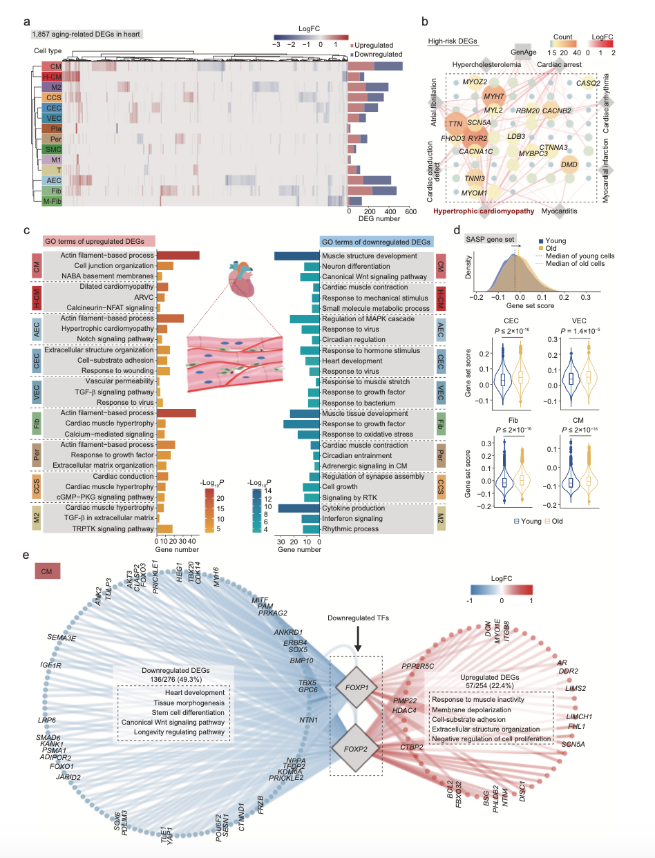 總的來說,老年肺組織中許多免疫細(xì)胞類型的比例增加,包括肥大性細(xì)胞和漿細(xì)胞,他們分泌細(xì)胞因子和抗體導(dǎo)致年齡相關(guān)性炎癥、慢阻肺病和肺纖維化的比例增加。 為了探索衰老心臟中細(xì)胞特異性的分子機制,作者篩選出了1857個差異基因(|logFC| > 0.25, P value < 0.05)(圖3a),其中數(shù)十個基因是肥厚型心肌病的熱點基因(圖3b)。反映了心臟中與年齡相關(guān)的基因表達(dá)變化與老年人心臟病高發(fā)之間的緊密聯(lián)系。