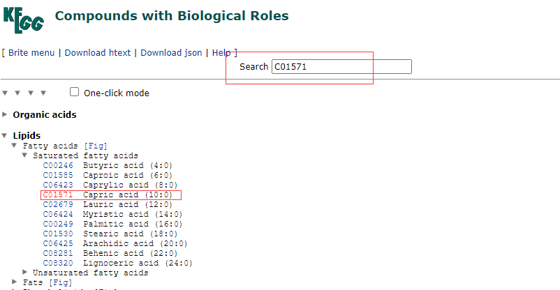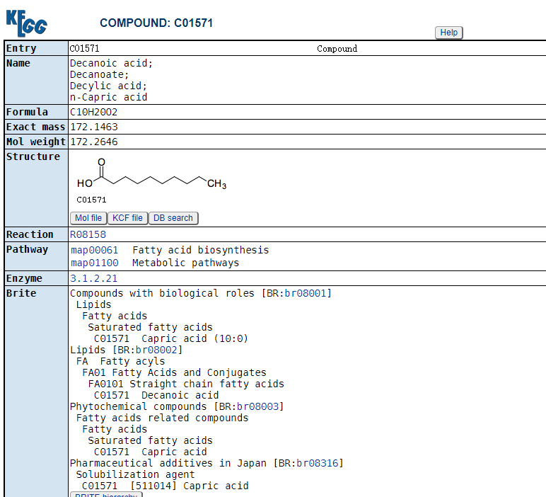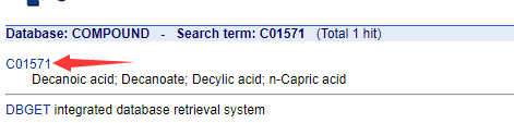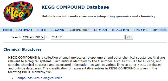 前文提到的KEGG(https://www.genome.jp/kegg/compound/)數(shù)據(jù)庫相信大家都不陌生,它是日本京都大學和東京大學聯(lián)合開發(fā)的數(shù)據(jù)庫。它有一個化合物庫,記錄了與通路相關(guān)的化合物,其化合物ID以C開頭,百邁客的分析結(jié)果提供了這個信息。這里我們將上述得到的C01571進行檢索: