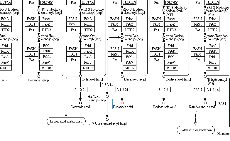點擊結(jié)果(上圖箭頭)就可以看到具體代謝物的信息,表格中展示了名稱、分子式、結(jié)構(gòu)、化學反應(yīng)、通路、酶等多種信息,查看通路信息可知道其參與了脂肪酸合成,點擊通路map00061可跳轉(zhuǎn)查看其在通路圖中的具體位置。