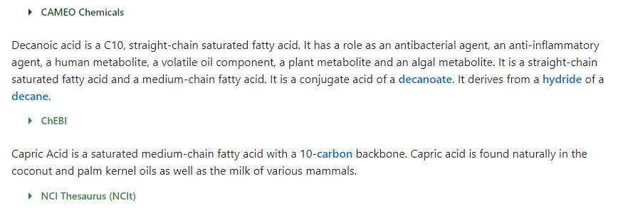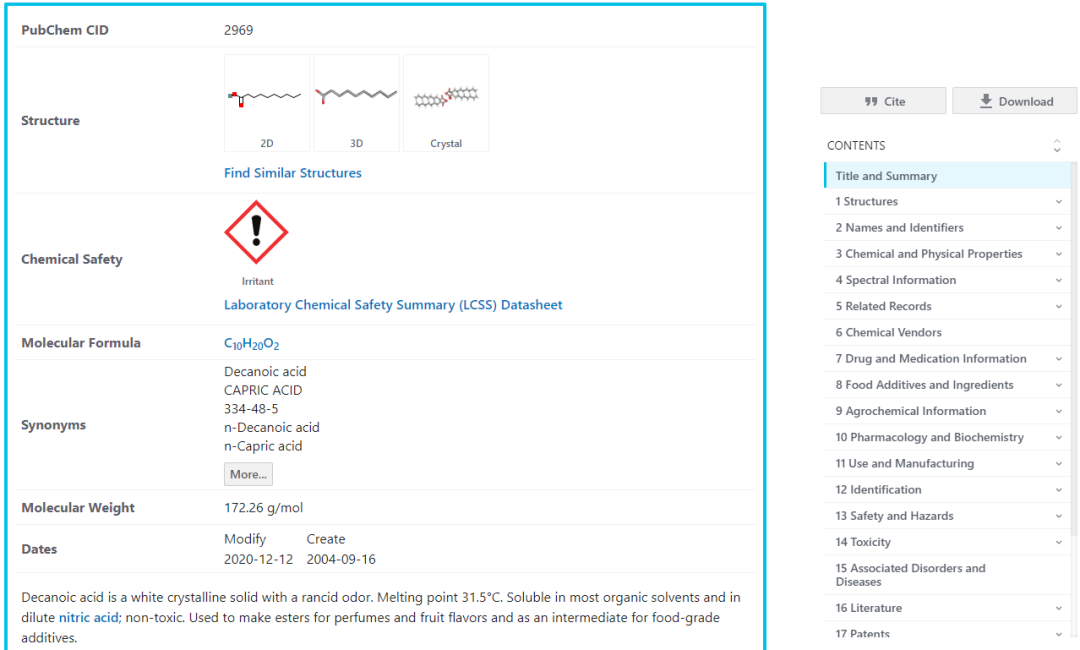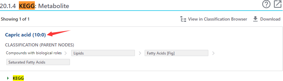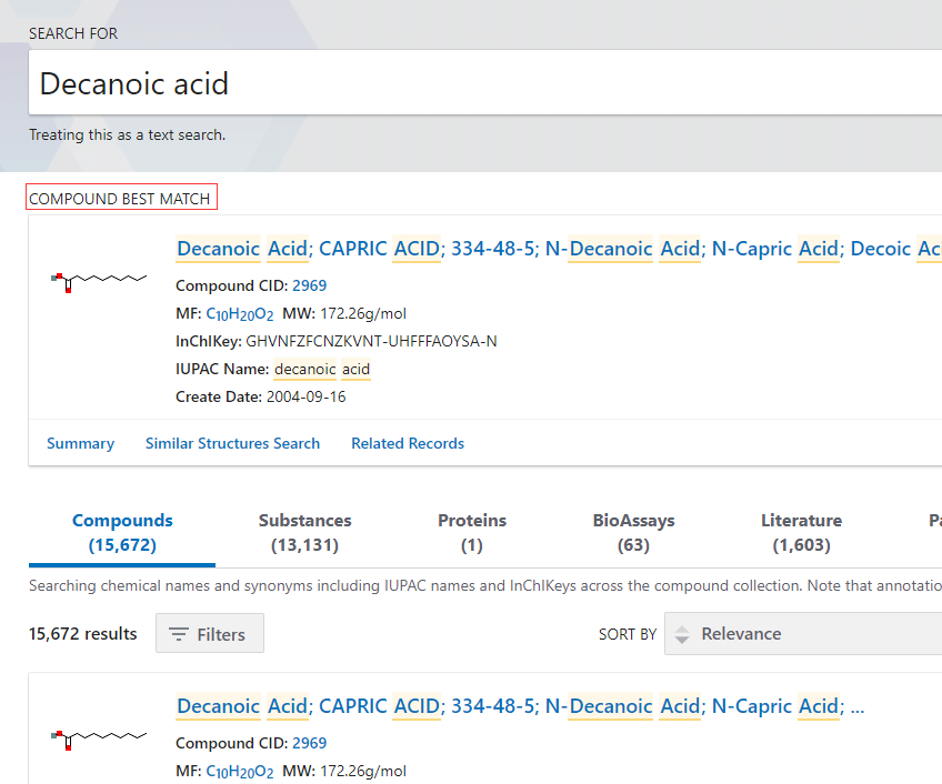 Pubchem(https://pubchem.ncbi.nlm.nih.gov/),它是NCBI下的一個大型的、綜合性的化合物數(shù)據(jù)庫,目前收錄了1億多種化合物信息,支持名稱、縮寫、化學式、系統(tǒng)命名等多種方式檢索,其結(jié)果包含了化合物的各種命名、相關(guān)聯(lián)的數(shù)據(jù)庫信息、結(jié)構(gòu)、分類、理化性質(zhì)、文獻、質(zhì)譜圖等多種信息。其中頁面開頭的摘要部分可快速了解到該物質(zhì)的特性、生物功能等信息,根據(jù)提供的文獻信息可幫助我們了解目前的研究情況。今天小編以“癸酸”為例教大家如何快速了解一個陌生的代謝組化合物。首先我們在主頁搜索欄中輸入癸酸英文名Decanoic acid,點擊搜索后會得到多個結(jié)果,置頂?shù)囊话銥樽罴哑ヅ?,這里是完全一致的,可以確認就是這個結(jié)果。
