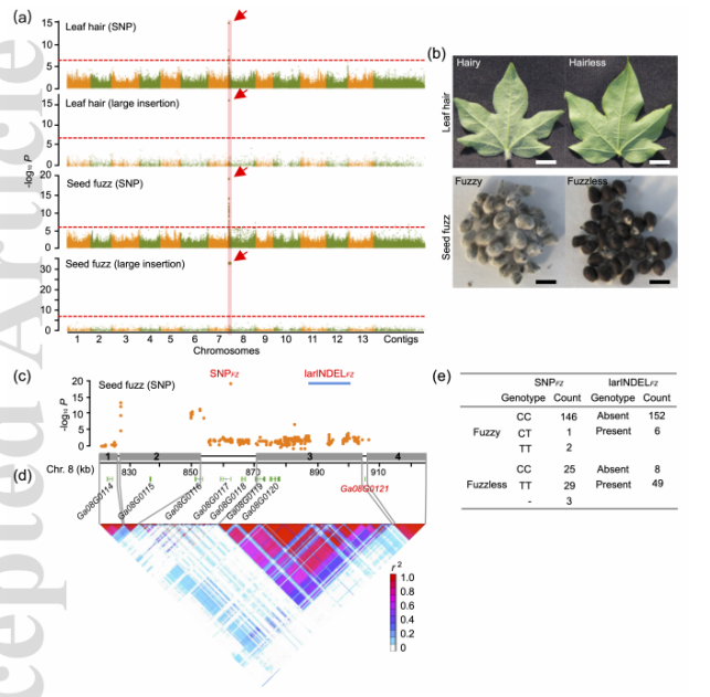 本研究中,作者利用215份亞洲棉自然群體,在前人基于SNP標(biāo)記的GWAS基礎(chǔ)上(Du et al.?2018),基于SV(結(jié)構(gòu)變異)標(biāo)記對(duì)種子短絨和葉茸毛性狀進(jìn)行GWAS,鑒定得到位于A08染色體末端的一個(gè)非編碼插入片段larINDELFZ與短絨和葉茸毛表型顯著相關(guān)(圖1a, b);連鎖不平衡分析發(fā)現(xiàn),在關(guān)聯(lián)區(qū)域有4個(gè)連鎖不平衡(LD)位點(diǎn),SNPFZ不位于這些位點(diǎn)內(nèi)(圖1c, d);對(duì)SNPFZ和larINDELFZ基因型與種子短絨的相關(guān)性進(jìn)行研究,發(fā)現(xiàn)只有l(wèi)arINDELFZ基因型與無茸毛表型高度相關(guān)(圖1e)。以上結(jié)果表明,插入片段larINDELFZ與種子短絨和葉茸毛性狀顯著相關(guān)。