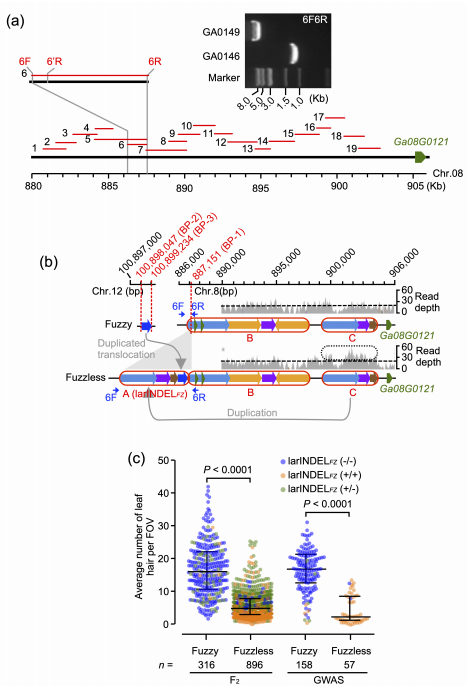 為了驗(yàn)證插入片段larINDELFZ,作者利用19個(gè)重疊引物在具有代表性的短絨和無絨材料(GA0146和GA0149)中進(jìn)行序列分析,發(fā)現(xiàn)短絨材料中有一個(gè)大小為6226 bp的插入片段larINDELFZ(圖2a);進(jìn)一步分析發(fā)現(xiàn),該插入片段由一個(gè)約5?kb的重復(fù)序列和一個(gè)約1.2?kb的易位片段組成(圖2b);作者在GWAS群體以及GA0146和GA0149構(gòu)建的包含1212單株的F2群體中分析larINDELFZ和表型的相關(guān)性,結(jié)果表明,位于亞洲棉第8染色體上的6226?bp的larINDELFZ與種子短絨和葉茸毛顯著相關(guān)(圖2c)。