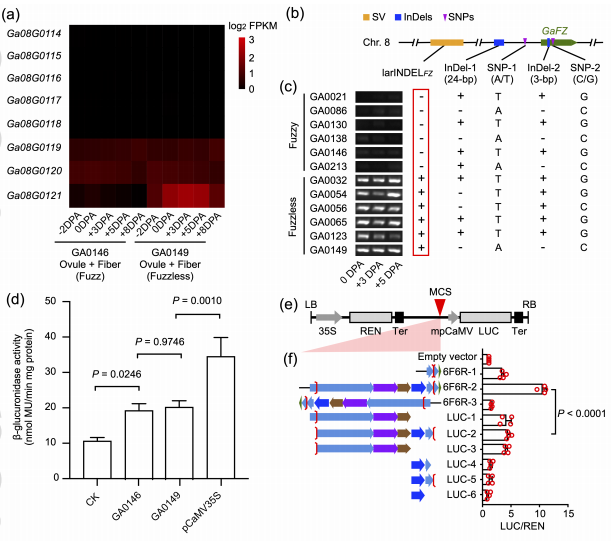 作者對(duì)關(guān)聯(lián)區(qū)域內(nèi)8個(gè)基因的表達(dá)模式分析,發(fā)現(xiàn)在短絨發(fā)育起始階段,無絨材料中GaFZ基因表達(dá)顯著高于短絨材料(圖3a);從GWAS群體中隨機(jī)挑選各6個(gè)短絨和無絨材料進(jìn)行基因和啟動(dòng)子序列分析,發(fā)現(xiàn)larINDELFZ存在于所有的無絨材料中(圖3b, c);熒光素酶活性分析實(shí)驗(yàn)結(jié)果表明,larINDELFZ可能扮演遠(yuǎn)端增強(qiáng)子角色特異激活其下游短絨發(fā)育關(guān)鍵基因的GaFZ?表達(dá)(圖3d, e)