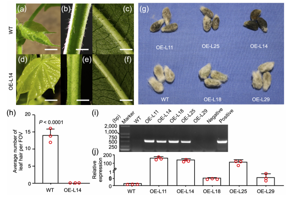 為了進(jìn)一步驗(yàn)證GaFZ基因的功能,作者分別在擬南芥和有短絨的陸地棉中過表達(dá)GaFZ基因,發(fā)現(xiàn)轉(zhuǎn)基因擬南芥葉茸毛的發(fā)育收到了明顯的抑制,同時(shí)轉(zhuǎn)基因棉花株系的莖毛、葉茸毛和短絨的發(fā)育也均受到了不同程度的抑制(圖a-h);但是,轉(zhuǎn)基因棉花和擬南芥中根毛的數(shù)量均沒有發(fā)生變化;qRT-PCR分析顯示,過表達(dá)株系中GaFZ基因顯著高于野生型(圖4i-j);結(jié)果表明,GaFZ基因可以抑制葉茸毛和短絨纖維的發(fā)育,而對(duì)根毛的發(fā)育沒有抑制作用。
