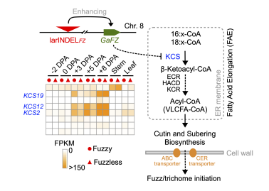 作者進(jìn)一步在短絨和無絨棉花材料和過表達(dá)的擬南芥材料中分析全基因共表達(dá)譜,在擬南芥和棉花的短絨關(guān)鍵發(fā)育階段,共鑒定出1343個(gè)和367個(gè)差異表達(dá)基因,這些基因主要參與次生代謝,如脂肪酸伸長(zhǎng)和角質(zhì)、栓質(zhì)和蠟質(zhì)的生物合成;結(jié)合互作分析發(fā)現(xiàn),GaFZ基因可能通過抑制超長(zhǎng)鏈脂肪酸伸長(zhǎng)途徑中關(guān)鍵基因的表達(dá),進(jìn)一步抑制脂肪酸延伸的下游途徑,從而影響短絨/葉茸毛的發(fā)育。作者基于基因功能分析,提出了一個(gè)亞洲棉短絨發(fā)育的可能機(jī)制(圖5)。