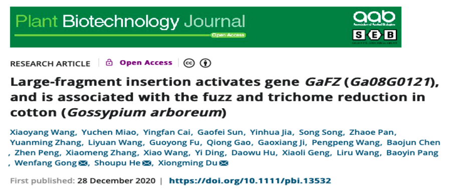 棉花是重要的天然纖維經(jīng)濟(jì)作物,在全球廣泛種植。今天給大家推薦的這篇文章是近日中棉所杜雄明老師團(tuán)隊(duì)與河南大學(xué)苗雨晨、蔡應(yīng)繁老師團(tuán)隊(duì)合作解析的研究成果“Large-fragment insertion activates gene?GaFZ?(Ga08G0121), and is associated with the fuzz and trichome reduction in cotton (Gossypium arboreum)”,該研究報(bào)道了一個(gè)新的棉花種子短絨/葉茸毛調(diào)控因子,并闡述其遺傳機(jī)制,最終該成果發(fā)表在國際知名期刊Plant Biotechnology Journal(IF=8.154)。