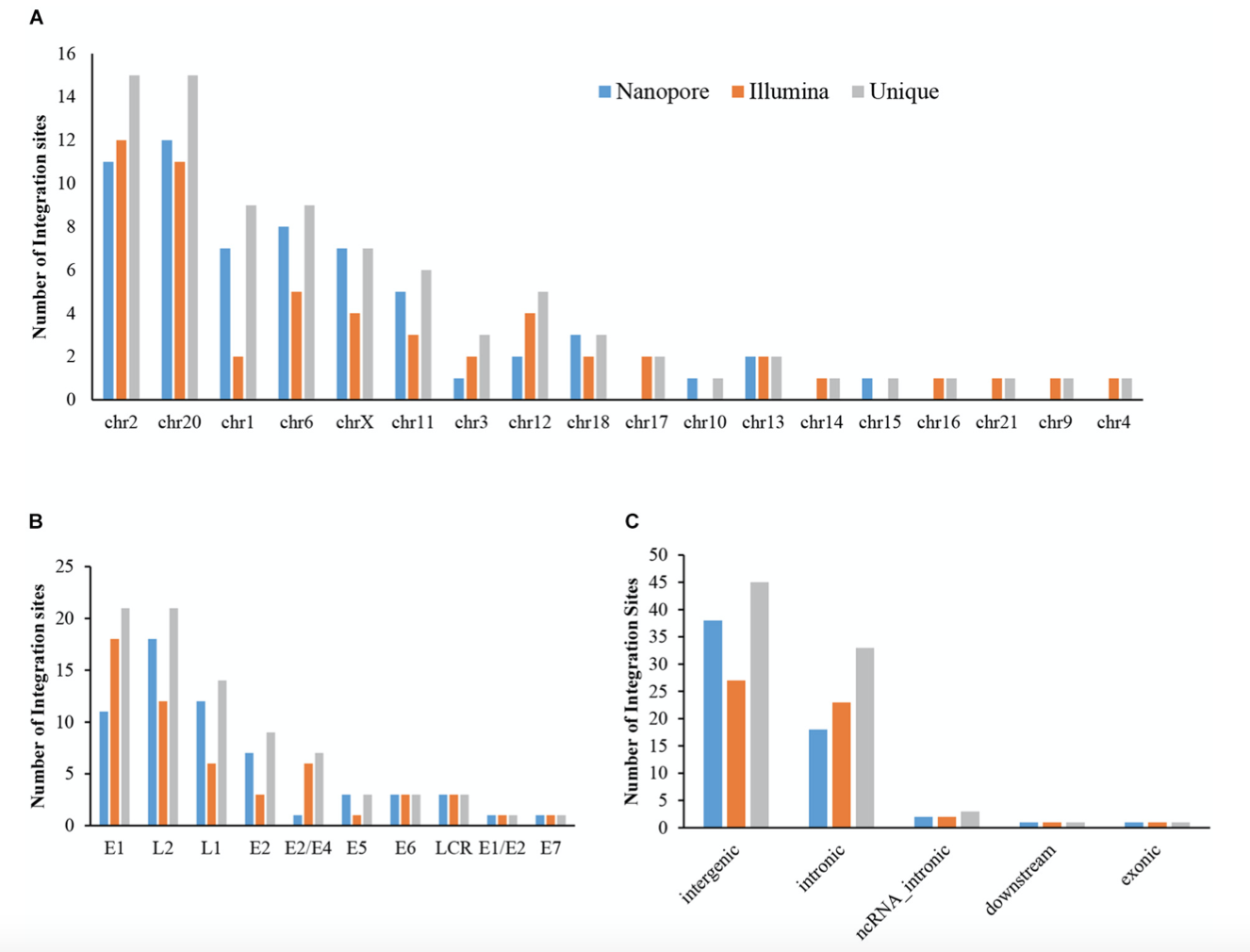 作者為了測試數(shù)據(jù)確定的新整合位點的準確性,利用Sanger測序進行驗證。總共選擇了14個整合位點進行驗證,并對13個進行PCR擴增并成功測序,表明這些整合位點的真正陽性,這些陽性位點大多由Nanopore和Illumina平臺鑒定。