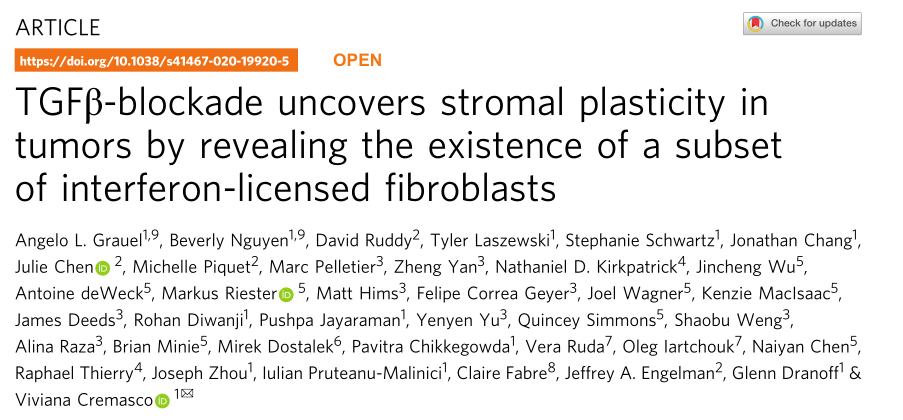 總之,這些數(shù)據(jù)表明,TGFβ-阻斷可導(dǎo)致小鼠和人類腫瘤成纖維細胞的重塑,暴露了一種獨特的CAF群體的誘導(dǎo),其特征是對IFN的明顯反應(yīng)和相當大的免疫調(diào)節(jié)潛能。