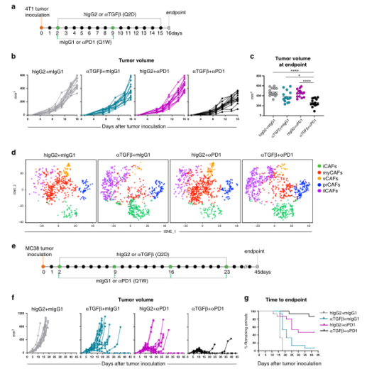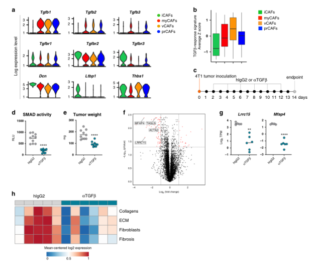 綜上所述,這些數(shù)據(jù)促使我們研究TGFβ-阻斷劑在體內(nèi)對CAF表型和功能的相對影響。為此,6周齡雌性小鼠接種4T1腫瘤細胞,隨后用TGFβ阻斷抗體或同型對照處理,研究設(shè)計如圖2c所示。結(jié)果表明這種腫瘤進展的延遲似乎不是由抗TGFβ對腫瘤細胞的直接作用引起的,更可能是TGFβ阻斷后微環(huán)境變化的結(jié)果。事實上,使用TGFβ中和抗體可導(dǎo)致整體基因表達的顯著差異,這在對大量冷凍腫瘤RNAseq分析中得到證實(圖2f)。與這些發(fā)現(xiàn)一致的是,我們通過分析與膠原沉積和纖維化相關(guān)的基因特征,描述了抗tgfβ治療小鼠腫瘤中整體促纖維化程序的顯著減少(圖2h)。綜上所述,這些數(shù)據(jù)表明靶向TGFβ影響了腫瘤微環(huán)境中的成纖維細胞動力學。