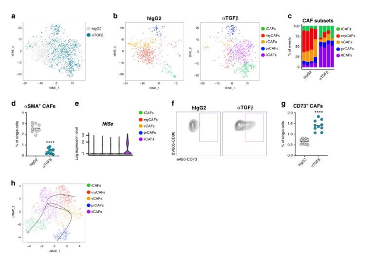 值得注意的是,在TGFβ-阻斷下肌成纖維細胞的丟失與一種獨特的CAFs(后來被稱為干擾素許可的CAFs, ilCAFs,圖4b, c為紫色)的出現(xiàn)形成對比,揭示了腫瘤微環(huán)境更廣泛的可塑性。ilCAFs很容易從其他CAF亞群中區(qū)分出來,因為與外切核苷酶Nt5e的基因及編碼的蛋白CD73上調(diào)相關(guān)(圖4f)。