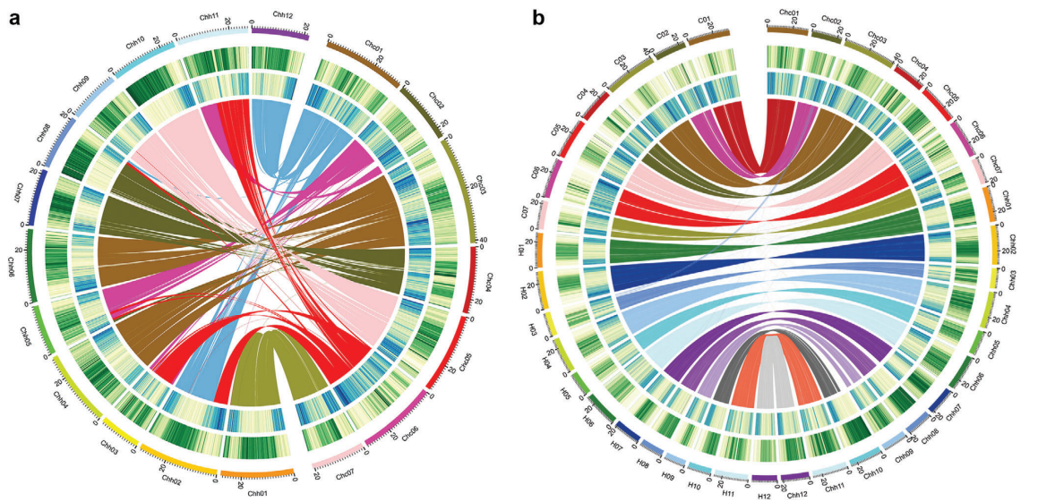 作者通過PacBio+BioNano+Hi-C+Illumina共組裝獲得530.8?Mb基因組(≈67%流式評估大?。弧?7% survey評估大??;比對發(fā)現(xiàn)未裝出的為重復序列),contig N50=6.5?Mb,并將組裝的基因組序列掛載至19條假染色體上(掛載率97.23%;定序與定向率93.33%)(表1)。通過與二倍體C.sativus (CC)和C.hystrix(HH)染色體的C01–C07和H01–H12對應,將C.×hytivus染色體命名為Chc01–Chc07和Chh01–Chh12(圖1)。