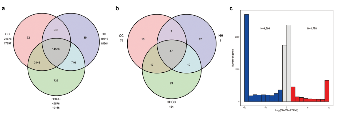 與已測序的栽培黃瓜基因組一樣,金瓜中大部分的TE為長末端重復序列。C.×hytivus(S14)的Chc亞基因組(SubC)含有的TEs少于二倍體C.sativus(CC)基因組,而Chh亞基因組(SubH)保持了幾乎相同的不同類型TEs的含量和比例。共預測了45687個基因,平均基因長3846bp,每個基因有5.26個外顯子。BUSCO評估結果為90.90%,CEGMA評估結果為97.82%。在CC和HH二倍體基因組中鑒定的18882個同源基因家族中,在C.×hytivus(S14)異源四倍體中也鑒定了18428個(97.60%)(圖2)。