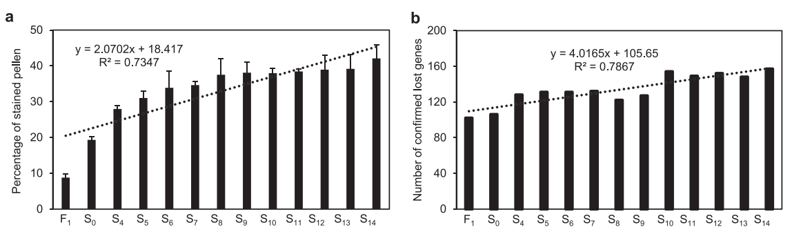 圖3F1及早期世代花粉可染性研究(左)及缺失基因數(shù)(右)