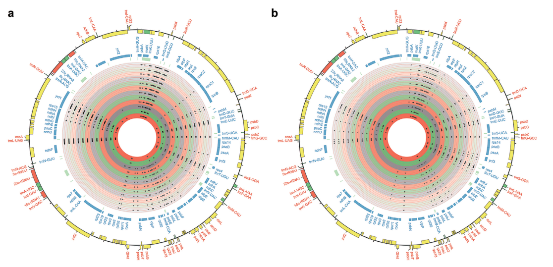 ?圖4 F1及早期世代葉綠體基因組SNPs(左)和InDels(右)分布