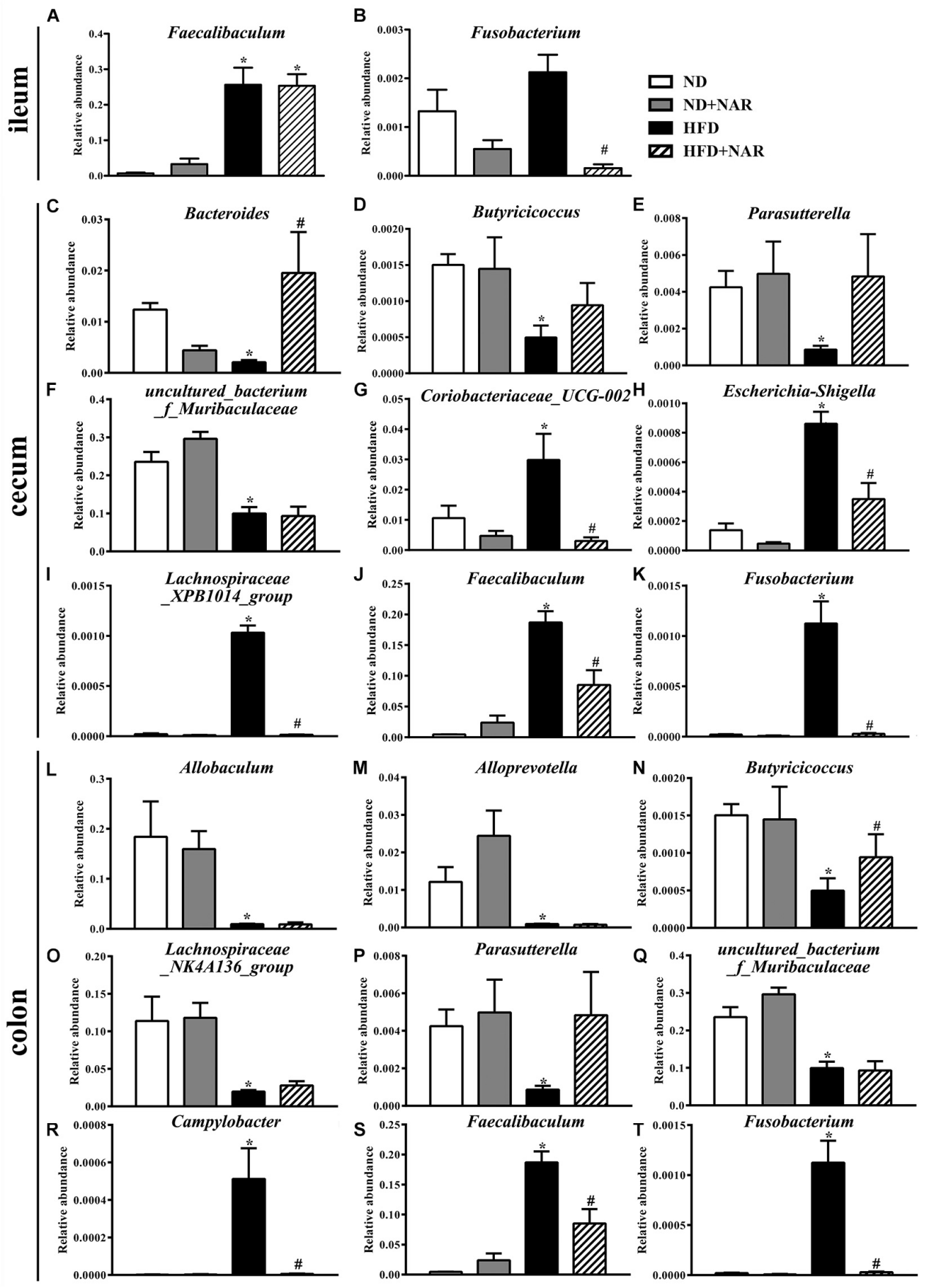優(yōu)勢菌屬和差異菌屬熱圖顯示,補(bǔ)充NAR改變了HFD誘導(dǎo)的腸道細(xì)菌變化(圖6D-F)。與ND組相比,HFD組盲腸中Coriobacteriaceae_UCG-002、Escherichia-Shigella、Faecalibaculum、Fusobacterium、Lachnospiraceae_XPB1014_group、Parvibacter、Ruminococcaceae_UCG-005和Turicibacter相對豐度較高,Campylobacter、Dubosiella、Faecalibaculum和Fusobacterium在結(jié)腸中相對豐度較高,Bacteroides在盲腸中相對豐度較低,Butyricicoccus在結(jié)腸中相對豐度較低。NAR處理逆轉(zhuǎn)了這些效果。與ND組相比HFD飼喂小鼠腸道菌群顯示Butyricicoccus、Parasutterella和uncultured_bacterium_f_Muribaculaceae在盲腸中相對豐度較低,Allobaculum、Alloprevotella、Lachnospiraceae_NK4A136_group、Parasutterella和uncultured_bacterium_f_Muribaculaceae在結(jié)腸中相對豐度較低,F(xiàn)aecalibaculum在回腸中相對豐度較高。HFD+NAR組Bradyrhizobium、[Eubacterium]_nodatum_group、GCA-900066575、Jatrophihabitans、Massilia、Peptococcus、Sphingomonas、uncultured_bacterium_o_Acidobacteriales、uncultured_bacterium_f_Micropepsaceae和uncultured_bacterium_f_Xanthobacteraceae在盲腸中相對豐度較高,Bacteroides、Bradyrhizobium、Candidatus_Solibacter和 uncultured_bacterium_f_Xanthobacteraceae在結(jié)腸中相對豐度較高,F(xiàn)usobacterium在回腸中相對豐度較低。圖7為相對豐度改變的細(xì)菌統(tǒng)計結(jié)果,這些結(jié)果表明NAR調(diào)節(jié)了HFD小鼠腸道細(xì)菌。