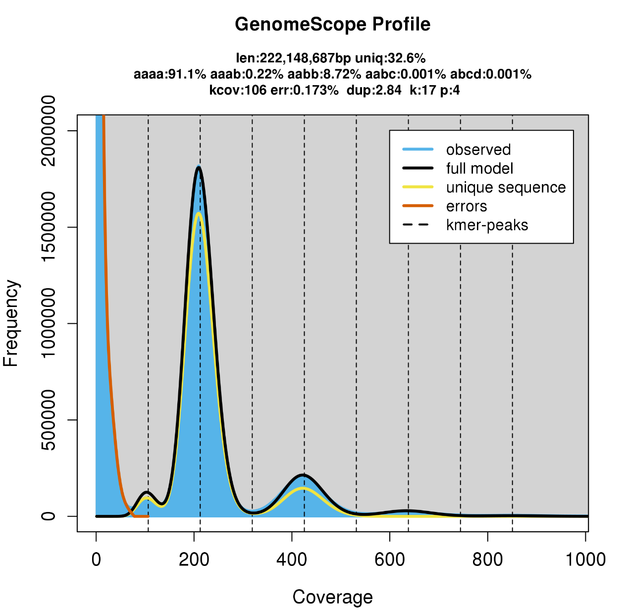 - 黃色擬合線被認(rèn)為來(lái)自基因組非重復(fù)區(qū)域的K-mer分布;