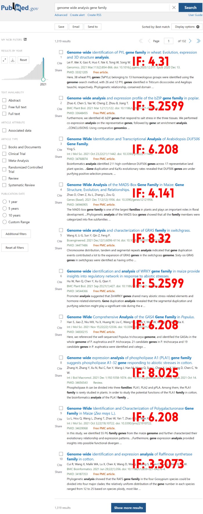 我們統(tǒng)計在2021年發(fā)表了1319篇相關(guān)的基因家族文章,而2022年到目前已經(jīng)發(fā)表了1241篇(使用genome wide of gene family關(guān)鍵詞檢索)??梢钥吹交蚣易逦恼逻@種套路文章發(fā)文之大。且如果進化做的好,可以分析一個基因家族在多個物種中演化規(guī)律,即可發(fā)更高水平的文章。