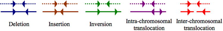 高通量測序數(shù)據(jù)除了可以分析SNP/InDel位點外,還可以利用雙端測序的中的插入片段長度信息和比對時出現(xiàn)的異常比對結(jié)果,對測序樣本中可能存在的結(jié)構(gòu)變異進行分析。本次課程主要利用BreakDancer這款軟件進行結(jié)構(gòu)變異位點的分析,軟件主要預(yù)測了五種類型的結(jié)構(gòu)變異:插入、缺失、倒位、染色體間和染色體內(nèi)易位,