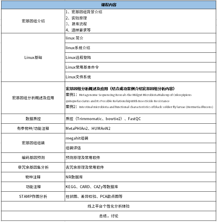 本課程從宏基因組背景介紹、實(shí)驗(yàn)(實(shí)驗(yàn)測(cè)序原理、建庫(kù)方法和流程、送樣注意事項(xiàng)等)、分析(下機(jī)數(shù)據(jù)質(zhì)控、有參注釋、無參組裝/預(yù)測(cè)/物種注釋/功能注釋等)、可視化作圖,讓您全面了解宏基因組分析每個(gè)過程,并結(jié)合案例文章,讓您了解宏基因組文章思路,助力科學(xué)研究。