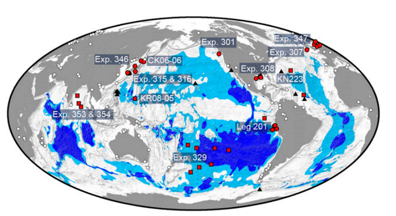 圖1 采樣地點的位置。紅色圓圈分別表示海洋邊緣站點,紅色方塊分別表示開放海洋站點。淺藍色和深藍色區(qū)域分別顯示整個沉積物中可能發(fā)生溶解氧和有氧活動的最大和最小區(qū)域。在14次科學考察中,從40個地點采集了海底以下許多不同深度的299個沉積物樣本,用于比較不同全球海底沉積物微生物群落組成。