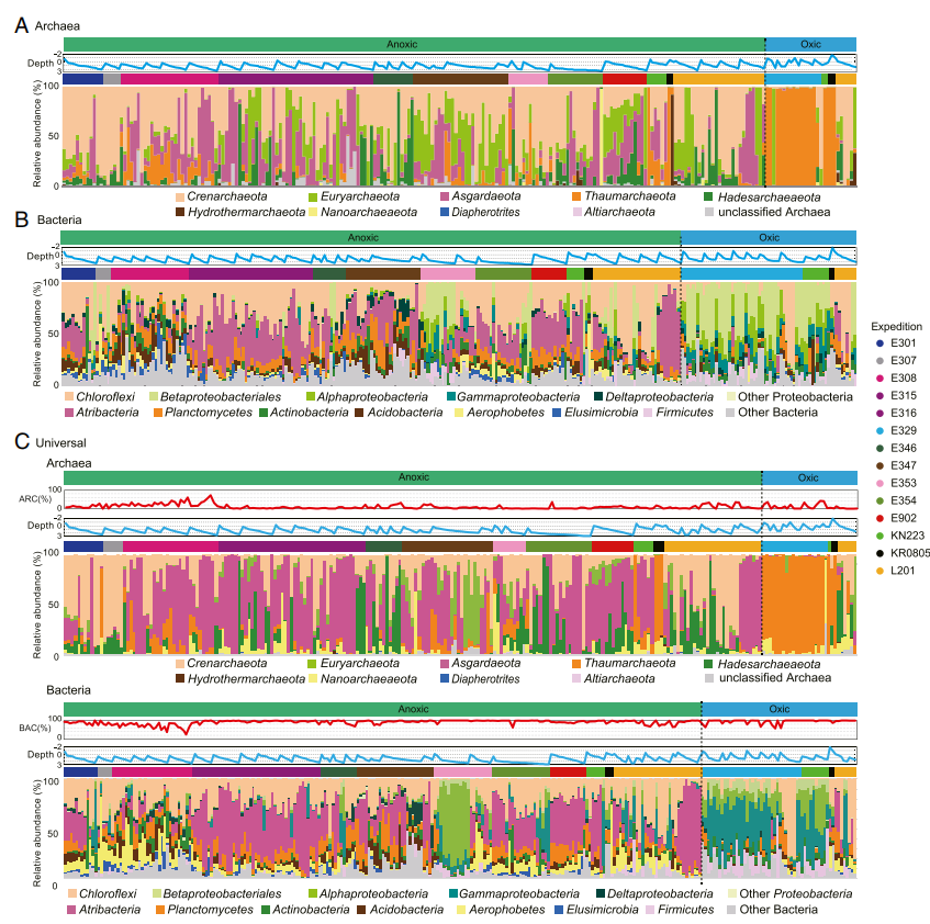 圖3 海洋沉積微生物群落的物種區(qū)系組成。(A)使用古菌特異性引物獲得的235個樣品的古菌群落組成。(B)使用細菌特異性引物獲得的272個樣品的細菌群落組成。(C)使用通用引物獲得的245個樣品的古菌群落組成和281個樣品的細菌群落組成,未顯示少于1,000條序列的樣本。淺藍色折線圖以對數(shù)刻度顯示沉積物深度。