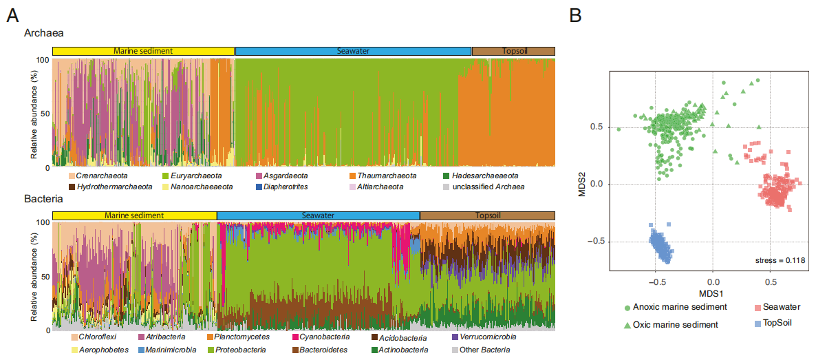 圖4 比較海洋沉積物、海水和表層土壤的微生物群落組成。(A)使用16S rRNA通用引物獲得的古菌和細菌群落組成。(B)使用從ASV中獲得的Jaccard相似性指數(shù)值生成的NMDS排序圖。