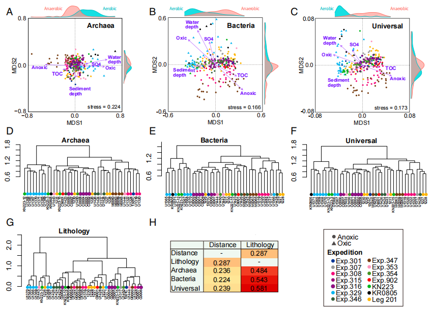 圖5 海洋沉積物微生物群落的β多樣性。(A–C)使用Jaccard相似性指數(shù)值生成的古菌(A),細菌(B)和通用引物數(shù)據(jù)集的NMDS排序圖。紫色箭頭表示與特征為P <0.01的環(huán)境因子相符的向量。(D–F)基于Jaccard相似性指數(shù)值,分別對40個地點的古菌(D),細菌(E)和通用引物數(shù)據(jù)集(F)進行算術(shù)平均(UPGMA)樹狀圖的非加權(quán)成對分組法。(G)基于40處沉積物的礦物成分的UPGMA巖性樹狀圖。(H)確定地理距離或巖性是否與微生物群落組成相關(guān)。