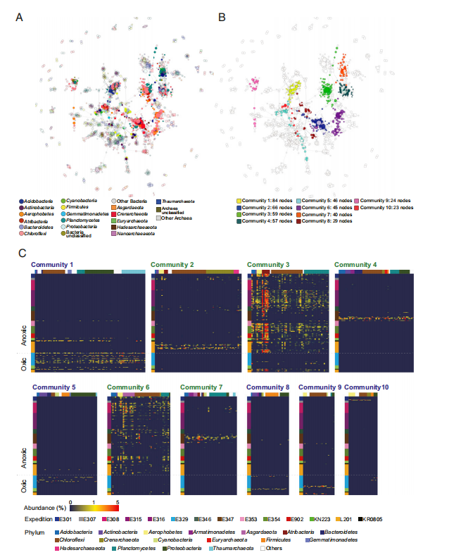 為了確定共現(xiàn)模式,作者基于使用通用引物獲得的ASV的Spearman相關(guān)性進行了網(wǎng)絡(luò)分析(r> 0.6,P <0.05;圖6)。生成的網(wǎng)絡(luò)圖包含1,533個節(jié)點(ASV),網(wǎng)絡(luò)的模塊化程度很高(0.84)。在圖6B中,僅顯示了10個最大的模塊,其中5個群落在有氧環(huán)境中普遍存在的模塊(群落1、5、8、9和10)和五個在缺氧沉積物中普遍存在的ASV組成的模塊(群落2、3、4、6和7)。在這10個群落中,群落1包含最多數(shù)量的ASV(84個ASV),主要由Chloroflexi、Proteobacteria和Thaumarchaeota組成(圖6C)。網(wǎng)絡(luò)圖顯示,Chloroflexi和Thaumarchaeota是共現(xiàn)網(wǎng)絡(luò)的重要成員(圖6A)。在五個缺氧沉積物群落中,群落3主要由Atribacteria、Chloroflexi和Planctomyces組成。網(wǎng)絡(luò)分析表明Chloroflexi是海洋沉積物環(huán)境中重要的微生物組成。但是,幾乎所有Chloroflexi都與MSBL9相關(guān)聯(lián),有報道表明MSBL9適合利用多種復(fù)雜的糖聚合物。簡而言之,共生網(wǎng)絡(luò)分析表明,海洋沉積物微生物群落組成受沉積物中氧化還原態(tài)和電子供體的影響。該分析結(jié)果還表明,海底沉積微生物彼此相互作用,以有效利用這種極端環(huán)境中可用的有限基質(zhì)。