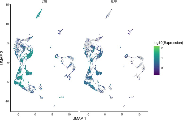 ?plot_cells(monocle_cds, genes=c(“LTB”, “IL7R”)) # 顯示某幾個基因的表達