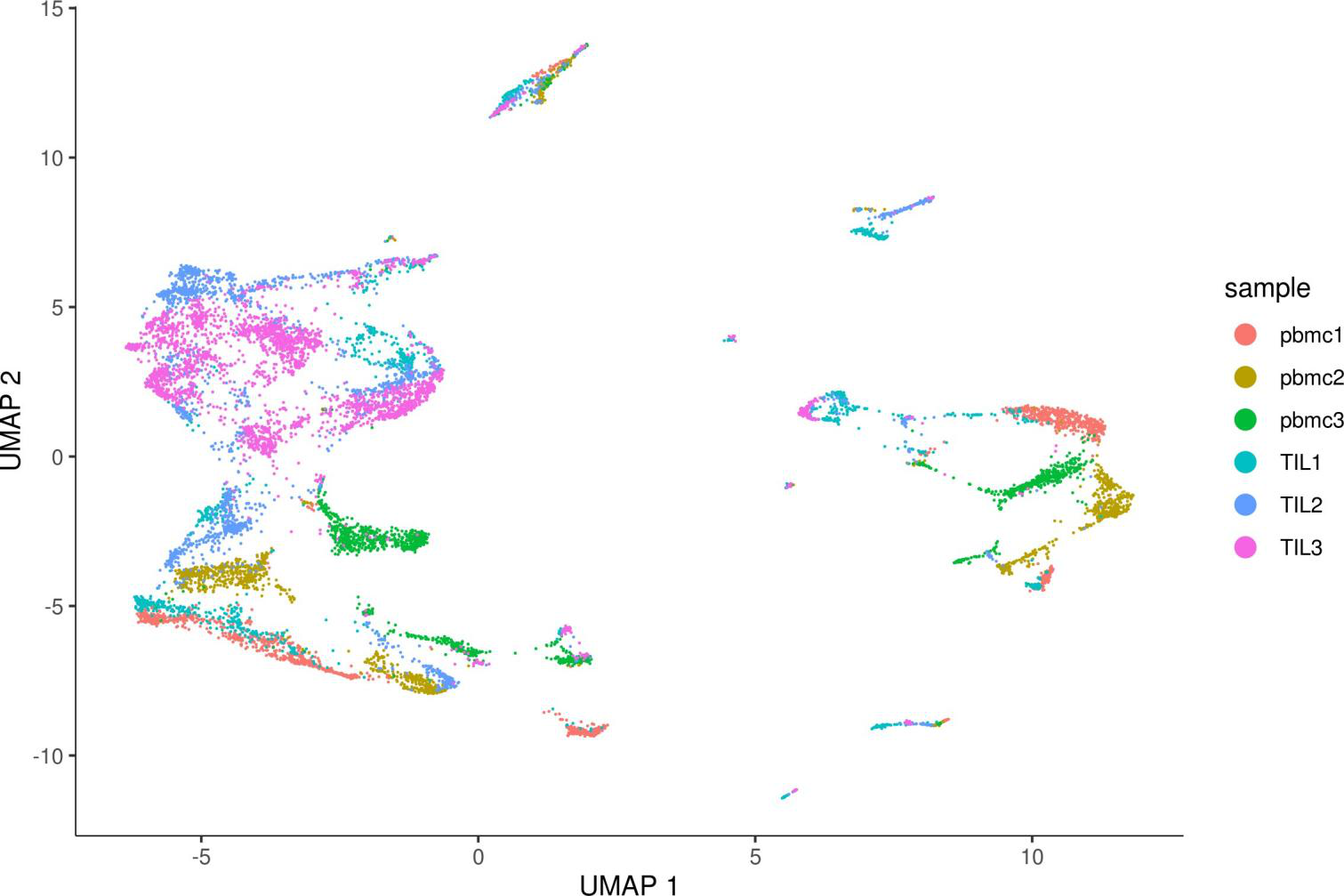 plot_cells(monocle_cds, color_cells_by=”sample”, label_cell_groups=FALSE) # 檢查樣本間的批次效應