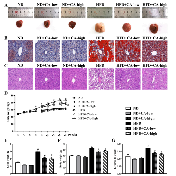 ND組小鼠隨機分為3組(n = 10),飼喂特定飼料,為期8周。這些組包括:1)喂食正常食物的ND小鼠;2)低ND+CA,喂食CA含量為0.08%的正常鼠糧;3)高ND+CA,喂食CA含量為0.16%的正常飼料。同時,高脂飲食組按以下飼料隨機分為3組(n = 10),飼養(yǎng)期8周。這些組包括1)高脂飲食小鼠;2) HFD+CA-low組,高脂日糧中添加0.08% CA;3) HFD+CA高組,飼喂添加0.16% CA的高脂飼糧,每2周測量體重。