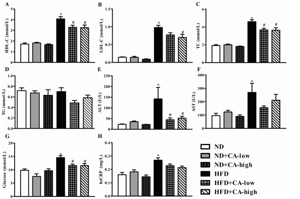 ? ? ? ? ?血清TC、TG、HDL-C和LDL-C升高是HFD組小鼠的主要特征。同樣,HFD組小鼠血清TC、HDL- C、LDL-C水平明顯升高,提示小鼠出現(xiàn)高脂血癥。CA處理在低和血清TC、TG、HDL-C和LDL-C升高是HFD組小鼠的主要特征。同樣,HFD組小鼠血清TC、HDL- C、LDL-C水平明顯升高,提示小鼠出現(xiàn)高脂血癥。CA處理在低和低濃度的TC、HDL-C和LDL-C對hfd誘導的血清高脂血癥有緩解作用。但各組間血清TG水平無顯著差異(圖2A-D)。在HFD組中,ALT、AST、葡萄糖和hsCRP水平均升高,而在喂食HFD的小鼠中,添加兩種濃度的CA只恢復了血清中ALT和葡萄糖(圖2E-H)。添加CA的ND小鼠與只添加ND的小鼠表現(xiàn)出幾乎相同的結果。