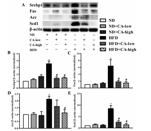 3.補充CA可調節(jié)高脂喂養(yǎng)小鼠脂肪生成相關蛋白表達