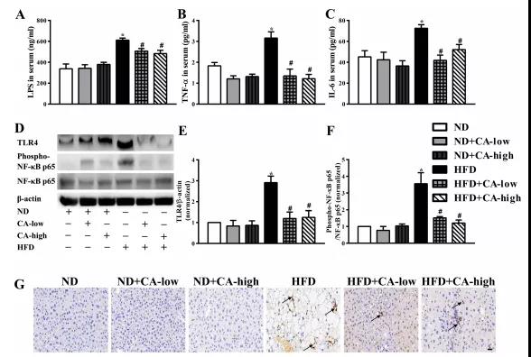有報道稱,NAFLD的特征是腸道菌群改變、炎癥和腸道屏障破壞。肝組織炎癥被認為是肝脂肪變性發(fā)展的驅動因素,腸道源性脂多糖被認為在肝臟炎癥中具有致病作用。最近的動物實驗研究關注了腸道菌群LPS在NAFLD發(fā)生中的作用。腸道源性LPS是革蘭氏陰性菌外膜的主要成分,通過TLR4信號通路和下游炎癥級聯(lián)反應促進炎癥反應。有報道稱,在NAFLD模型中,與野生型小鼠相比,tlr4缺陷小鼠的肝損傷、炎癥和脂質積累減少。此外,阻斷腸道菌群與宿主細胞之間的脂多糖- tlr4相互作用可以阻止高脂喂養(yǎng)小鼠NAFLD的啟動和發(fā)展,這證實了脂多糖- tlr4通路在誘導NAFLD中具有非常重要的作用。與之前的研究結果一致,我們的研究表明,16周高脂飲食導致血清LPS和肝臟TLR4表達顯著增加,肝組織中磷酸化的NF-kB p65被激活,表明炎癥開始。同時,高脂喂養(yǎng)小鼠血清TNF-a、IL-6水平升高,肝臟mpo陽性細胞浸潤。所有劑量的CA補充均顯著扭轉了上述現(xiàn)象;在添加ca的ND組中沒有觀察到顯著差異(圖4A-G)。