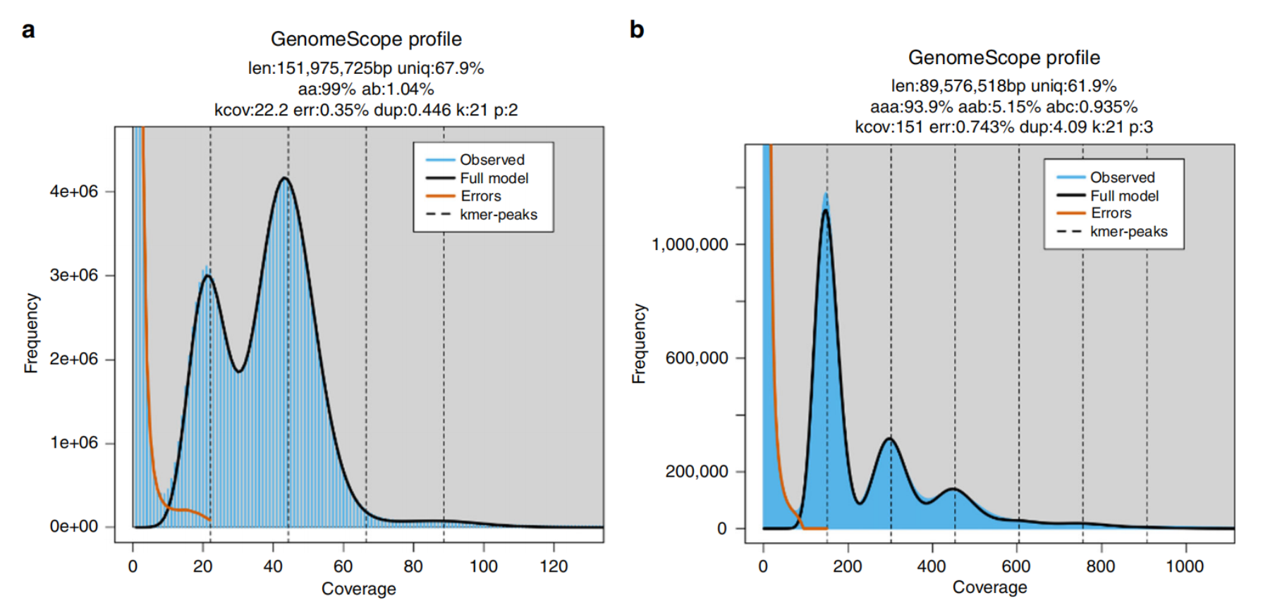 ? ? ? ?但僅知道物種大小是遠遠不夠的,現(xiàn)在為了完成更高質量基因組組裝通常需要選擇不同類型的材料。例如為了構建0?Gap的高連續(xù)性基因組,會選擇超高純合度的材料(通過自交純合或是花藥培養(yǎng)等)來降低組裝中的障礙。亦或是為了完成二倍體基因組雙單倍體的組裝,選擇超高雜合度的材料(例如遠緣雜交或是野生材料篩選等)來增加基因組中同源對的差異,從而進行區(qū)分與組裝。