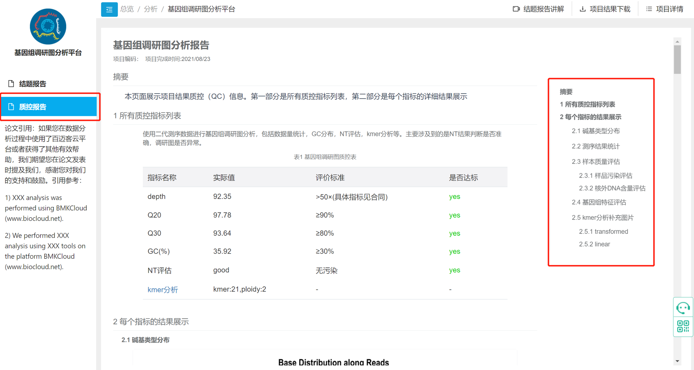 分析完成即可在線查看項目結題報告與數(shù)據(jù)質控報告。報告將對整體數(shù)據(jù)質量、污染評估、基因組特征、使用軟件版本等進行詳細描述。具體可見下圖右部目錄。