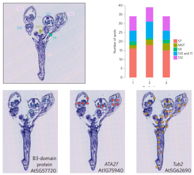 擬南芥花苞中空間轉錄組檢測莖、分生組織、以及3個不同花區(qū)域空間基因表達,一共檢測到20215個基因,鑒定開花有關的兩個關鍵基因At5g57720(已知的在S3和S9表達的基因)和 ATA27 (At1g75940,已知的在S11和S12表達的基因)的√確的空間定位可視化,組織區(qū)域特異性基因和通路的顯著差異,發(fā)現(xiàn)雄蕊絲發(fā)育通路在S11(雄蕊絲伸長的位置)和莖中富集,在莖中維管通道大量存在,并且細胞伸長和維管發(fā)育過程非?;钴S。其中花粉外壁形成途徑在S10和S11發(fā)生改變,在這個階段,外壁是花粉壁的主要組成部分之一,在絨氈層產生并沉積在花粉前細胞上??臻g基因表達特征揭示了組織區(qū)域異質性,并為植物生長發(fā)育過程和相應功能的探索提供了高分辨率的空間植物基因表達模式,從新的維度探索植物發(fā)育過程。
