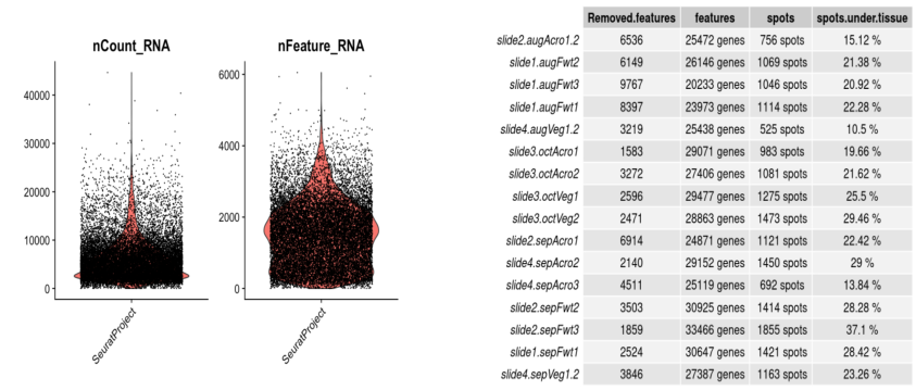 挪威云杉是瑞典經(jīng)濟的重要出口樹種,它可能需要20-25年的樹木成熟時期。為了培育優(yōu)良品種, Stefania Giacomello and Jens Sundstr?m結合10x Visium技術進一步研究挪威云杉野生型和早期圓錐形突變體Picea abies var. acrocona的雌性生殖發(fā)育中的空間基因表達模式,該技術捕獲區(qū)域為6.5mm*6.5mm,含有5000個spot,每個spot直徑為55μm,以更高的分辨率鑒定云杉雌芽的空間發(fā)育特征。選取三個類型不同時期挪威云杉(Wildtype, Acrocona or Vegetative;August, September, October)作為研究材料,一共檢測了16個樣本,每個樣本檢測到26000個基因左右,每個spot基因檢出率為525-1855個。